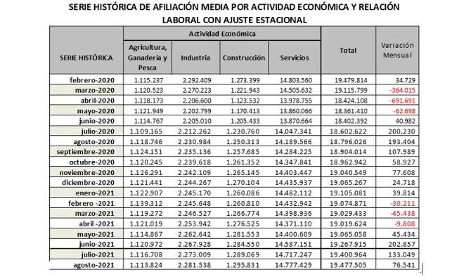 Por otra parte, según datos facilitados por el Ministerio de Inclusión, Seguridad Social y Migraciones, el número de afiliados a la Seguridad Social ha ascendido a 19.477.505 personas en agosto en términos desestacionalizados, experimentándose un incremento de 76.541 trabajadores respecto al mes anterior (un 0,39% más).