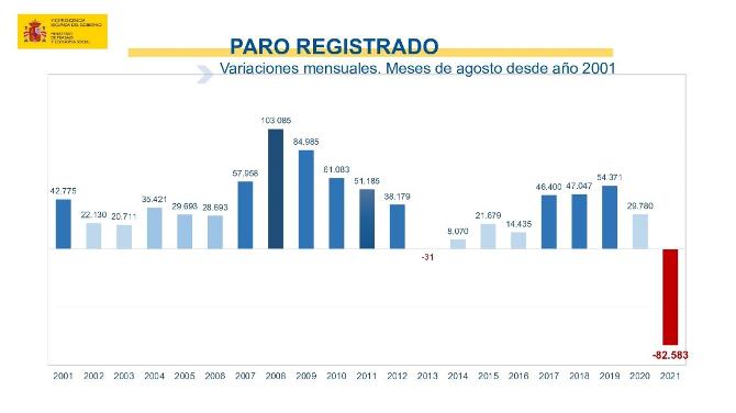 Además, según ha confirmado el Ministerio de Trabajo y Economía Social, se trata de la mayor caída del paro registrado en un mes de agosto de toda la serie histórica. Desde febrero, el paro acumula ya una reducción de 675.000 personas.