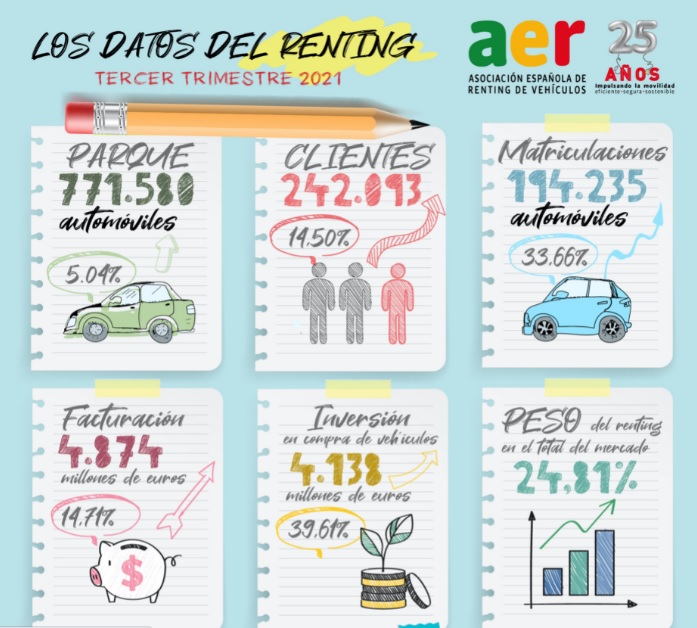 El parque de vehículos en renting, al cierre del tercer trimestre de 2021, se eleva a 771.580 unidades, con un crecimiento del 5,04% sobre el mismo periodo de 2020 según datos facilitados por la AER. El número de clientes en renting se incrementa un 14,50% y se sitúa en 242.093, son 30.662 más.