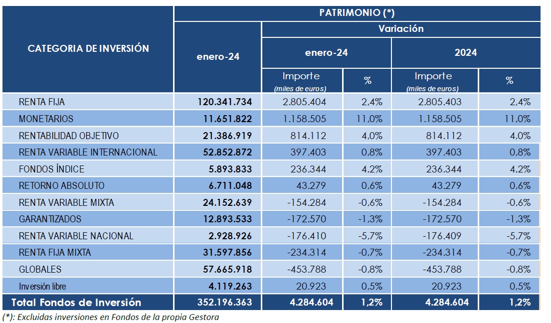 El patrimonio de los Fondos de Inversión aumentó en enero en más de 4.200 millones, superando los 352.000 millones de euros y colocándose en máximos históricos. Las suscripciones netas en el primer mes del año han sido de 2.343 millones de euros encadenando así 39 meses consecutivos con suscripciones netas positivas y la rentabilidad mensual se sitúa en el 0,6%, según datos facilitados por Inverco.