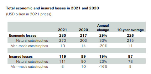 En términos generales, las pérdidas aseguradas en 2021 sumaron 119.000 millones de dólares; a las catástrofes naturales hay que sumar los 8.000 millones ocasionados por el hombre y que el pasado año registraron un retroceso del 16%.