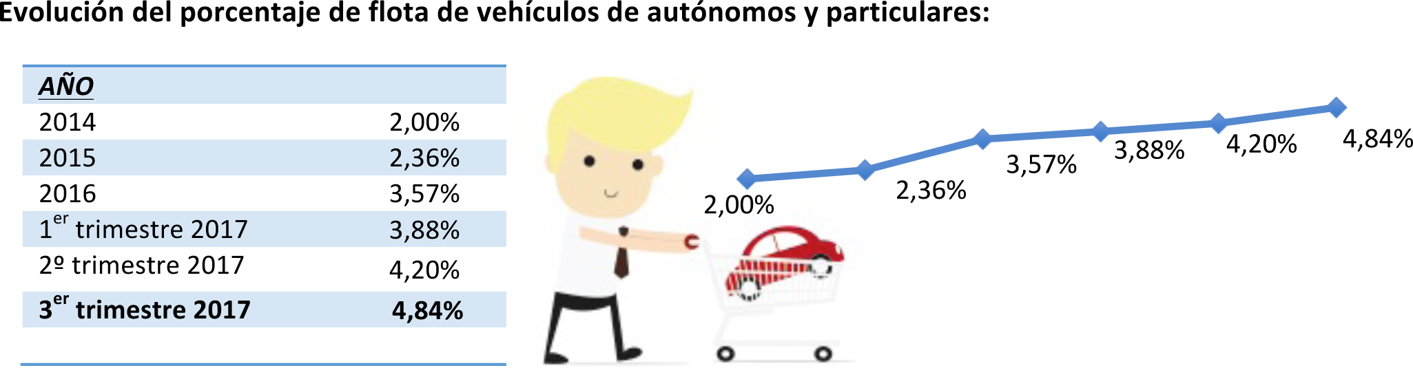 La Asociación Española de Renting de Vehículos (AER) ha dado a conocer los datos del sector, al cierre del tercer trimestre de 2017. Según estos registros, la flota de vehículos aumentó un 10,79%, sobre septiembre de 2016. Este crecimiento situó la flota de vehículos en renting en España en 544.339 unidades. Las personas físicas (autónomos y particulares) han tenido un papel protagonista en este crecimiento de la flota, dado que ya se acercan al 5% de cuota en renting, un 4,84%. En cuanto a las matriculaciones de automóviles, hasta septiembre se registraron 189.990 unidades en renting, lo que supuso un crecimiento del 21,8%, en relación al mismo periodo de 2017. El peso del renting en las matriculaciones totales fue del 17,32%. Respecto al volumen de facturación, éste creció un 10,3%, con un total de 3.615 millones de euros.