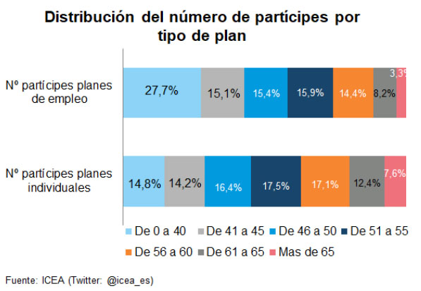 La entidad muestra que mientras los menores de 40 años suponen menos del 15% del total de los Planes de Pensiones personales, alcanza el 28% en Planes de Empleo, lo que parece un indicativo "de que fomentar el ahorro complementario para la jubilación pasa por fomentar el desarrollo del ahorro a través de las empresas".