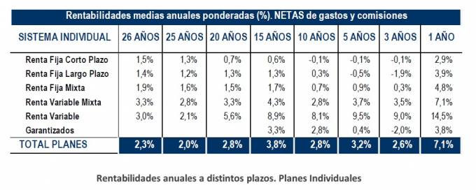 Las rentabilidades en el medio-largo plazo se mantienen positivas. Por ejemplo, a 20 años, los Planes de Pensiones registran una rentabilidad media anual (neta de gastos) del 2,8% y, en el medio plazo (10 y 15 años), presentan una rentabilidad del 2,8% y 3,8% respectivamente.