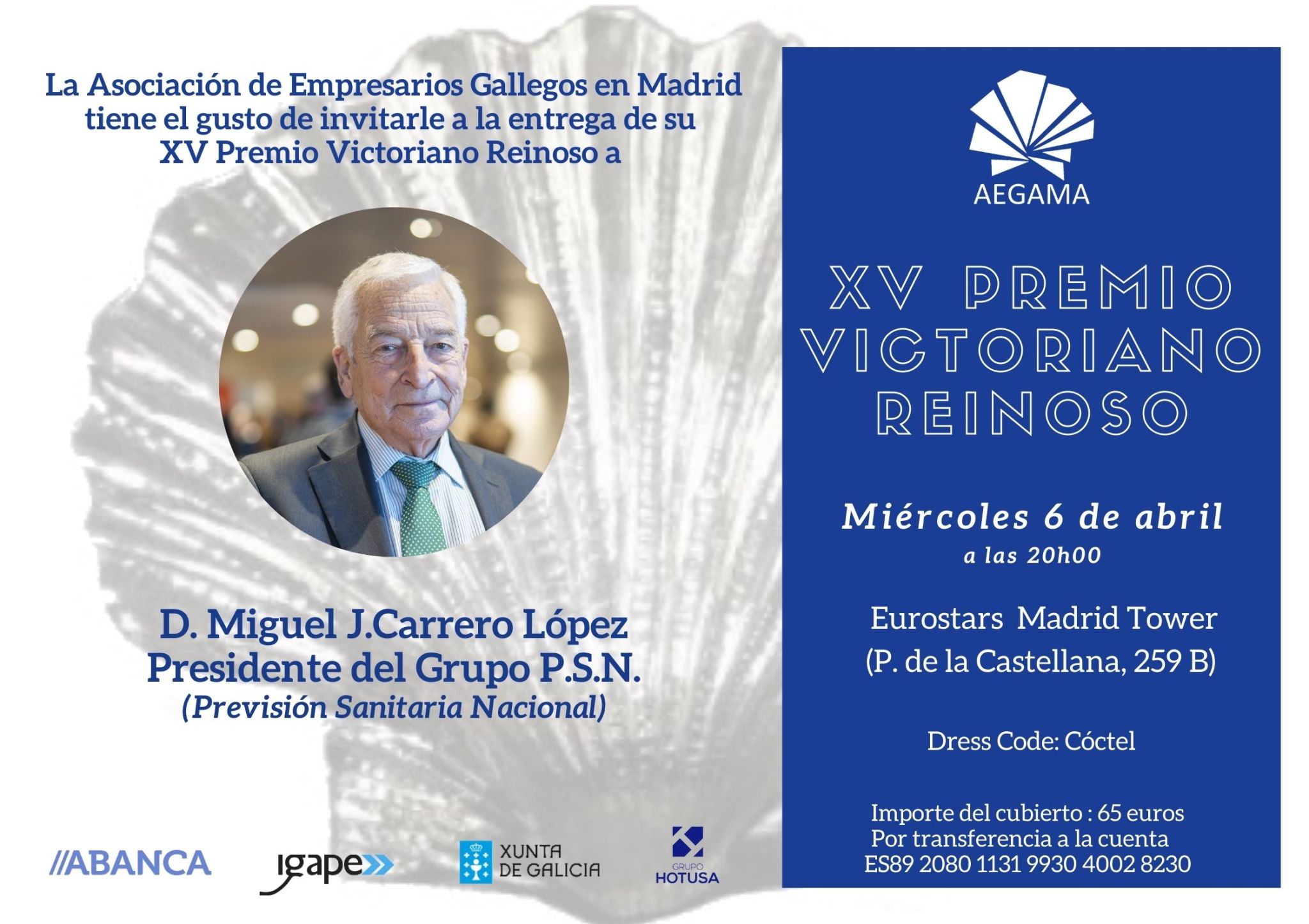 Miguel Carrero, presidente de Previsión Sanitaria Nacional (PSN) recibirá el XV Premio Victoriano Reinoso en reconocimiento a su trayectoria profesional. Se trata del galardón que entrega la Asociación de Empresarios Gallegos en Madrid (Aegama) con el objetivo de "destacar a aquellos profesionales que han desarrollado una importante labor profesional en ámbitos de especial relevancia", según explica la entidad.