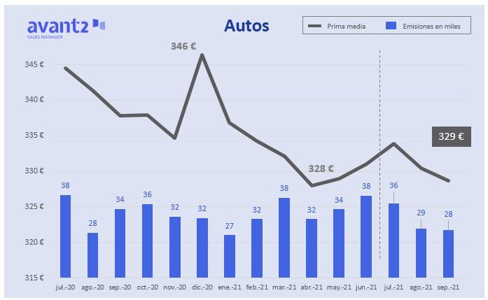 La prima media del seguro de Autos sigue su tendencia a la baja. Al cierre del tercer trimestre se ha situado en 329 euros, según datos de Avant2 Sales Manager extraídos tras analizar su cartera. En este ramo, la prima media está cayendo desde diciembre de 2019, cuando alcanzó los 353 euros.