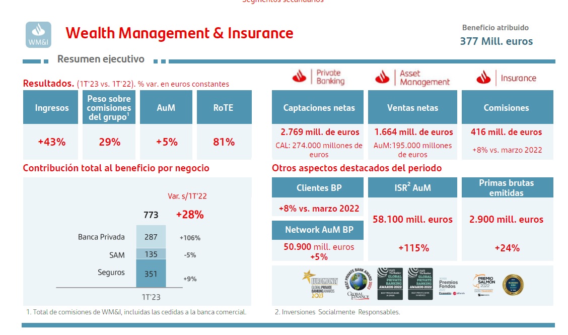 Seguros de Banco Santander que forma parte de la división Wealth Management & Insurance aportó un 9% del beneficio total del Grupo, según informa la entidad en la presentación de los resultados del primer trimestre del año.