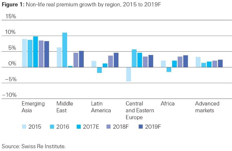 Swiss Re espera que las primas de No Vida a nivel global crezcan al menos un 3% en 2018 y 2019, pero el avance podría ser mayor dependiendo de la magnitud del esperado incremento de los precios. Los mercados emergentes liderarán el crecimiento, con un incremento de primas de entre el 6% y el 7% anual en términos reales los 2 próximos años. El informe también destaca que los ramos de No Vida han reducido su rentabilidad en 2017, con el ROE cayendo hasta el 3% desde el 6% de 2016. En 2018 y 2019 el ROE se podría colocar en torno al 7%-8%.