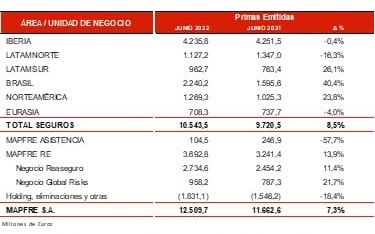 Según los resultados avanzados por Mapfre, la primas del grupo han crecido un 7% en el primer semestre del año hasta los 12.509 millones de euros, aunque el Grupo hubiera tenido un crecimiento del 7,7% ajustado por los siguientes efectos no recurrentes: la venta de Bankia Vida a finales de 2021 (-0,8%), la póliza plurianual relevante de México emitida en 2021 (-4,5%) y la apreciación de las divisas en 2022 (+4,9%).
