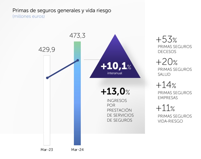 Por ramos, las primas de seguros de Decesos crecieron un 53%; las de seguros de Salud un 20%; las de seguros de Empresas un 14% y las de seguros Vida Riesgo un 11%.
