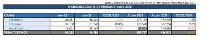 Por segmentos, hay dos canales en números negros en el acumulado del año: particulares, con 177.132 matriculaciones y un aumento del 1,2% respecto a 2021; y empresa, con 171.590 unidades y una subida del 2,3%. Si bien, en junio, particulares ha descendido un 2% mientras que empresas ha repuntado un 18,4%. Por el contrario, alquiladores ha caído un 48,3% en el acumulado del año en relación a 2021, con tan solo 59.035 matriculaciones, y en junio no le fue mucho mejor (-43,1%).
