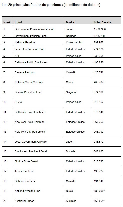 El Fondo de Inversión de Pensiones del Gobierno de Japón (GPIF) sigue siendo el mayor Fondo de Pensiones del mundo, con un total de activos que supera los 1,7 billones de dólares. Lleva ocupando el primer puesto desde 2002.