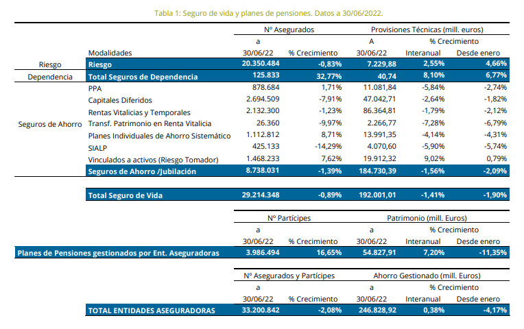 El Ahorro gestionado correspondiente a los seguros de Vida (Riesgo, Dependencia y Seguros de Ahorro) alcanza los 192.001 millones, con un retroceso del 1,41%, mientras que la parte de Planes de Pensiones cuya gestión corresponde a las aseguradoras se eleva un 7,2% en términos interanuales hasta cerca de 55.000 millones.