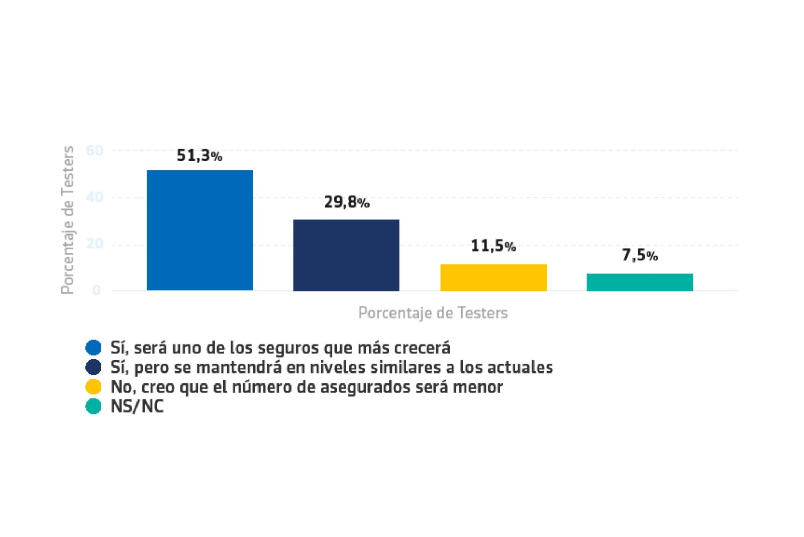 Con relación a las perspectivas de los seguros de Salud, más del 80% de los clientes encuestados calcula que la contratación de estos seguros médicos irá al alza en los próximos años. En esta línea, el 51,3% pronostica que será uno de los seguros que más crecerá.