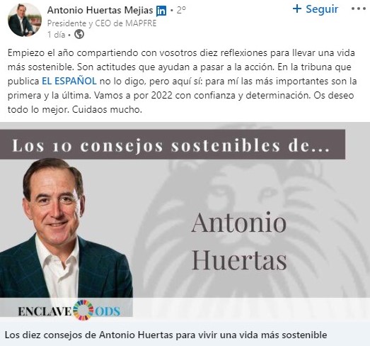 El presidente de Grupo Mapfre, Antonio Huertas, ha dado a conocer en la red social Linkedin su decálogo para llevar una vida más sostenible. También indica que por encima de las "acciones están las actitudes" y añade que "ahí es donde de verdad podemos avanzar más rápido en nuestro compromiso con la sostenibilidad".