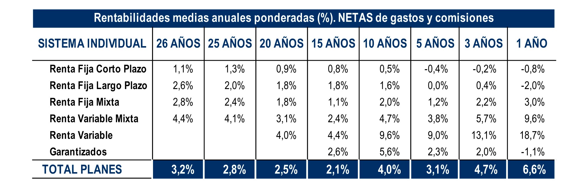 Los datos avanzados por Inverco al cierre de enero sitúan la rentabilidad a 1 año de los Planes de Pensiones en el 6,6%. Para el largo plazo (25 años), registran una rentabilidad media anual del 2,8% mientras para el medio plazo (10 y 15 años), presentan una rentabilidad del 4% y 2,1% respectivamente. De nuevo la Renta Variable ofrece retornos elevados, del 9,6% anual a 10 años y más del 18,5% en un año.