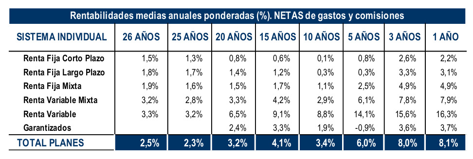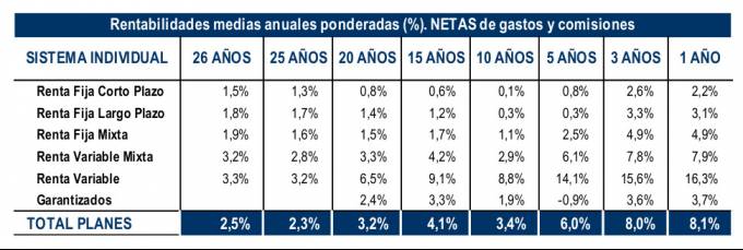 Por su parte, la rentabilidad interanual para el conjunto de Planes se situó por encima del 8%. Destaca la categoría de Renta Variable que obtuvo una revalorización del 16,3%, y los Renta Variable Mixta con el 7,9%. A más largo plazo (5 años) la categoría de Renta Variable aporta una rentabilidad media anual del 14,1% y superior al 9% a 15 años.