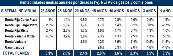 La rentabilidad media interanual (neta de gastos) de los Planes de Pensiones Individuales se situó en el 3,5% en el mes de febrero, según datos publicados por Inverco. Algo por debajo estuvo la rentabilidad media anual en el largo plazo (25 años), que marcó un 2,8%, y también en el medio plazo (15 años), que registró un 2%. La rentabilidad a 10 años experimentó el mejor comportamiento al situarse en el 3,6%.