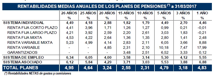 Para el conjunto de Planes de Pensiones, la rentabilidad media anual neta de comisiones y gastos se eleva al 4,8%, muy superior a la inflación del período (2,3%). Destacan los Planes de Renta Variable, que tras el buen comportamiento de las bolsas internacionales en este primer trimestre se anotan un rendimiento de casi el 18% anual.