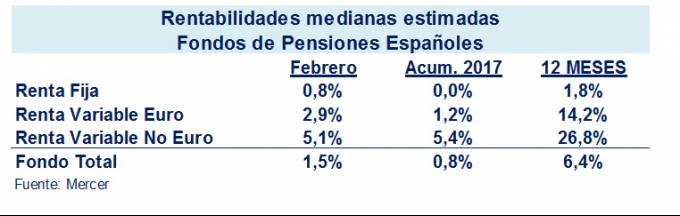 Los Fondos de Pensiones de Empleo obtuvieron en febrero una rentabilidad mediana del 1,5%, por lo que en los dos primeros meses del año acumulan un 3,6%, según el informe PIPS de Mercer. En todas las clases de activo la rentabilidad fue positiva: la renta fija obtuvo una rentabilidad mediana en febrero del 0,8%; la renta variable euro del 2,9%; y la renta variable no euro del 5,1%.