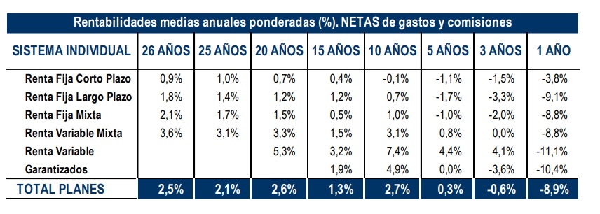 La rentabilidad en el año del conjunto de planes acumula un 8,9% de pérdidas, siendo la renta variable (-11,1%) y los garantizados (-10,4%) los que más caen.