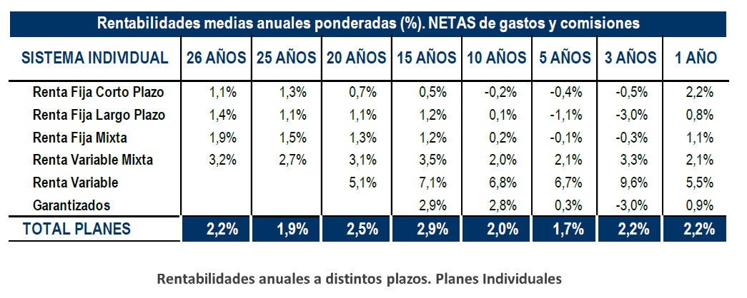 Las rentabilidades en el medio-largo plazo siguen manteniéndose positivas. Por ejemplo, a 20 años, los Planes de Pensiones registran una rentabilidad media anual (neta de gastos) del 2,5% y, en el medio plazo (10 y 15 años), presentan una rentabilidad del 2% y 2,9% respectivamente.