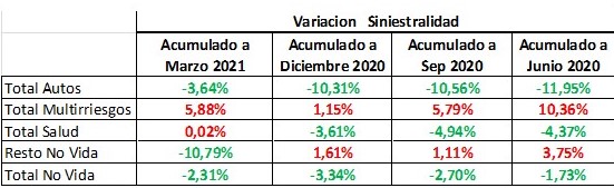 A medida que se incrementa la actividad, aumenta la siniestralidad en los seguros de No Vida. Según Global Actuarial, a marzo de 2021, la siniestralidad ha crecido significativamente en Multirriesgos, aumentando un 5,88% respecto al mismo periodo del ejercicio anterior, y también ha crecido en Salud, aunque en menor medida (0,02%) pero se rompe así la tendencia de los trimestres anteriores.