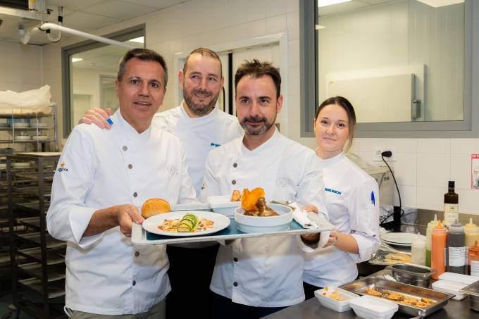 A raíz de esta iniciativa, los chefs del restaurante Disfrutar, de tres estrellas Michelin -Mateu Casañas, Oriol Castro y Eduard Xatruch-, en colaboración con la gastrónoma Irene Flores y el equipo de cocina de Serunion, han pensado y elaborado un menú especial, que constará de tres platos: canelón de verduras con toques mediterráneos, como primer plato; pollo con chocolate y picada navideña de segundo; y, de postre, crema catalana de turrón.