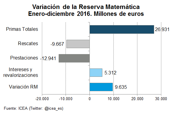 Las reservas matemáticas de los seguros de Ahorro se situaron a 31 de diciembre de 2016 en 177.818 millones de euros, con un crecimiento de 9.635 millones respecto al año anterior, informa ICEA. En los seguros con garantía de interés el aumento fue de 10.746 millones, frente a los 1.110 millones que disminuyeron los seguros vinculados a activos.
