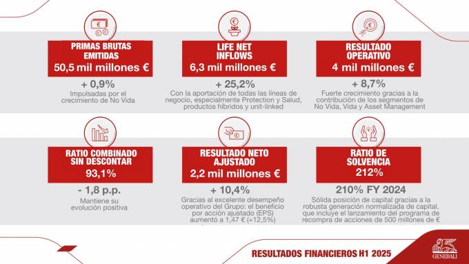 Grupo Generali ha dado a conocer los resultados del semestre. La compañía ha obtenido un resultado operativo de 4.049 millones de euros, un 8,7 % más, gracias al buen desempeño de los segmentos de No Vida, Vida y Asset Management, en línea con las prioridades estratégicas del plan "Lifetime Partner 27: Driving Excellence".