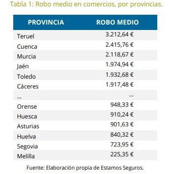 En 2021, los robos más caros en comercios se produjeron en estas 3 provincias: Teruel, Cuenca y Murcia. Así consta en el informe 'Los robos en comercios. Datos 2021', elaborado por Estamos Seguros, la iniciativa para la divulgación de la cultura aseguradora puesta en marcha por Unespa. En estas tres provincias, el seguro tuvo que hacer frente a indemnizaciones medias de entre 2.100 y 3.200 euros.