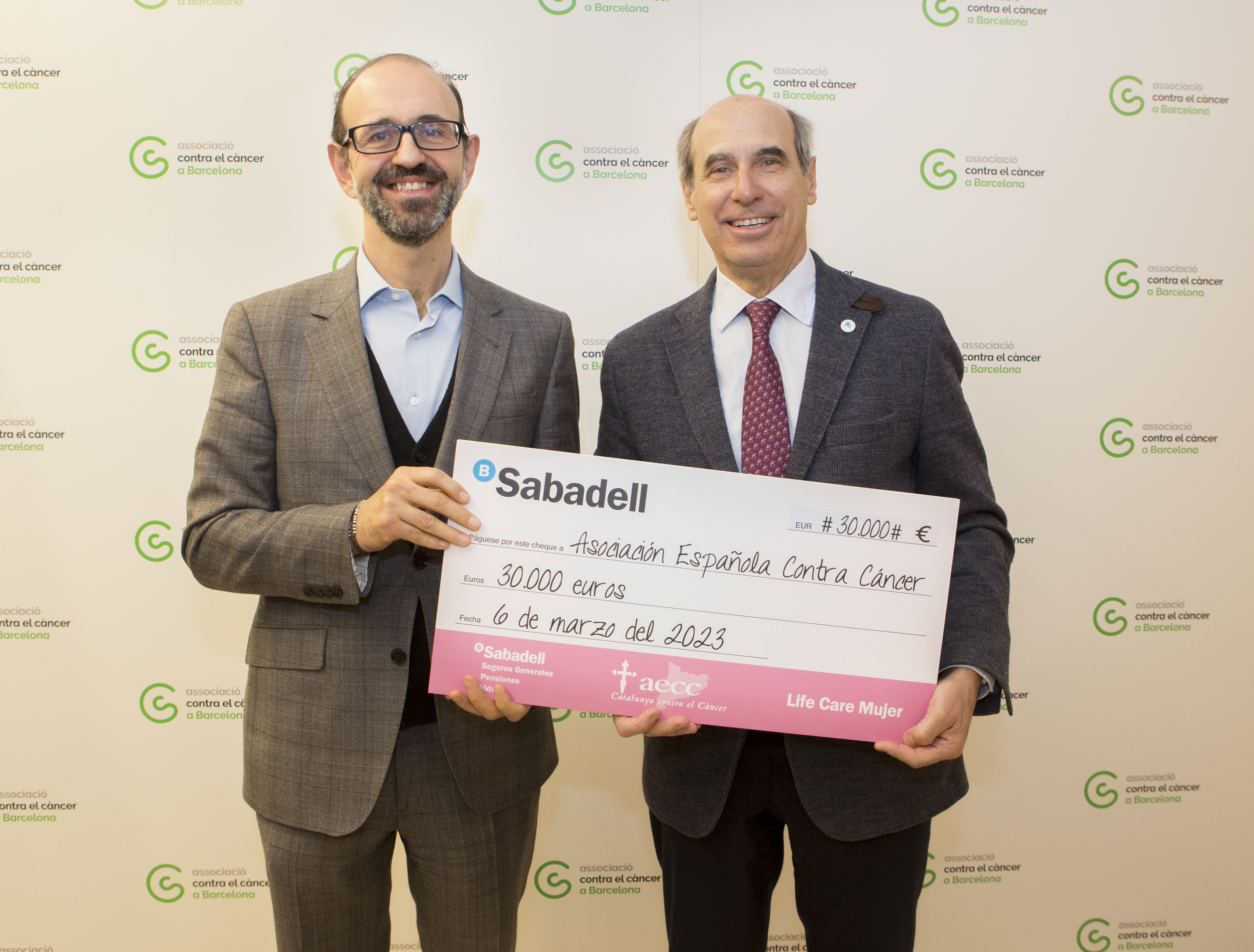 Bernardino Gómez Aritmendi, director general de Sabadell Seguros, ha entregado el cheque al doctor Laureano Molins, presidente de la Asociación Española Contra el Cáncer en Barcelona. "Llevamos desde 2018 colaborando con la Asociación Española Contra el Cáncer gracias a Life Care Mujer, un seguro de Vida que creamos para que nuestras clientas, en caso de necesidad, pudieran centrarse en su lucha y en su recuperación gracias a una dotación económica de hasta 70.000 euros en caso de cáncer. Y no solo eso, decidimos donar por cada póliza contratada 3 euros a la investigación contra el cáncer femenino y colaborar con proyectos tan importantes como este. Al fin y al cabo, se trata de ir más allá de la filantropía e involucrarnos directamente con esta causa concreta, para ser coherentes con nuestro ADN y nuestro rol de protección. Queremos atender problemas reales de nuestro territorio y comunicarlo para generar conciencia social".