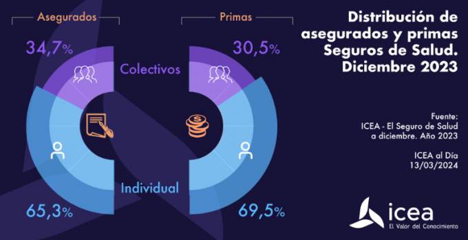 El informe 'El seguro de Salud a diciembre. Año 2023' que ha elaborado ICEA, muestra que los seguros individuales de Salud gobiernan este negocio con mano firme. Así, representan casi el 70% y más del 65% de los asegurados. Por su parte, el sector de colectivos acapara algo más del 30% en recaudación y cerca del 35% en asegurados.