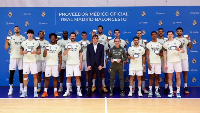 Sanitas ha entregado a la plantilla de baloncesto del Real Madrid, y a su entrenador, Sergio Scariolo, las tarjetas sanitarias digitales. Con ellas, los deportistas podrán acceder a los servicios más avanzados en medicina digital desarrollados por la compañía, como la videoconsulta médica o los sistemas de seguimiento y monitorización mediante distintos dispositivos. La entrega de las tarjetas ha tenido lugar hoy en el pabellón de entrenamiento de la Ciudad Deportiva del Real Madrid, en Valdebebas.