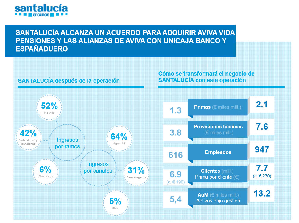 La compra convertirá a santalucía en la 9ª entidad del mercado español por volumen de primas, se convierte en el nuevo socio de Vida y Pensiones del Grupo Unicaja Banco. Además, la aseguradora consigue diversificar sus productos y canales de distribución con la intención de que Vida alcance el 50% de sus ingresos en 2020.