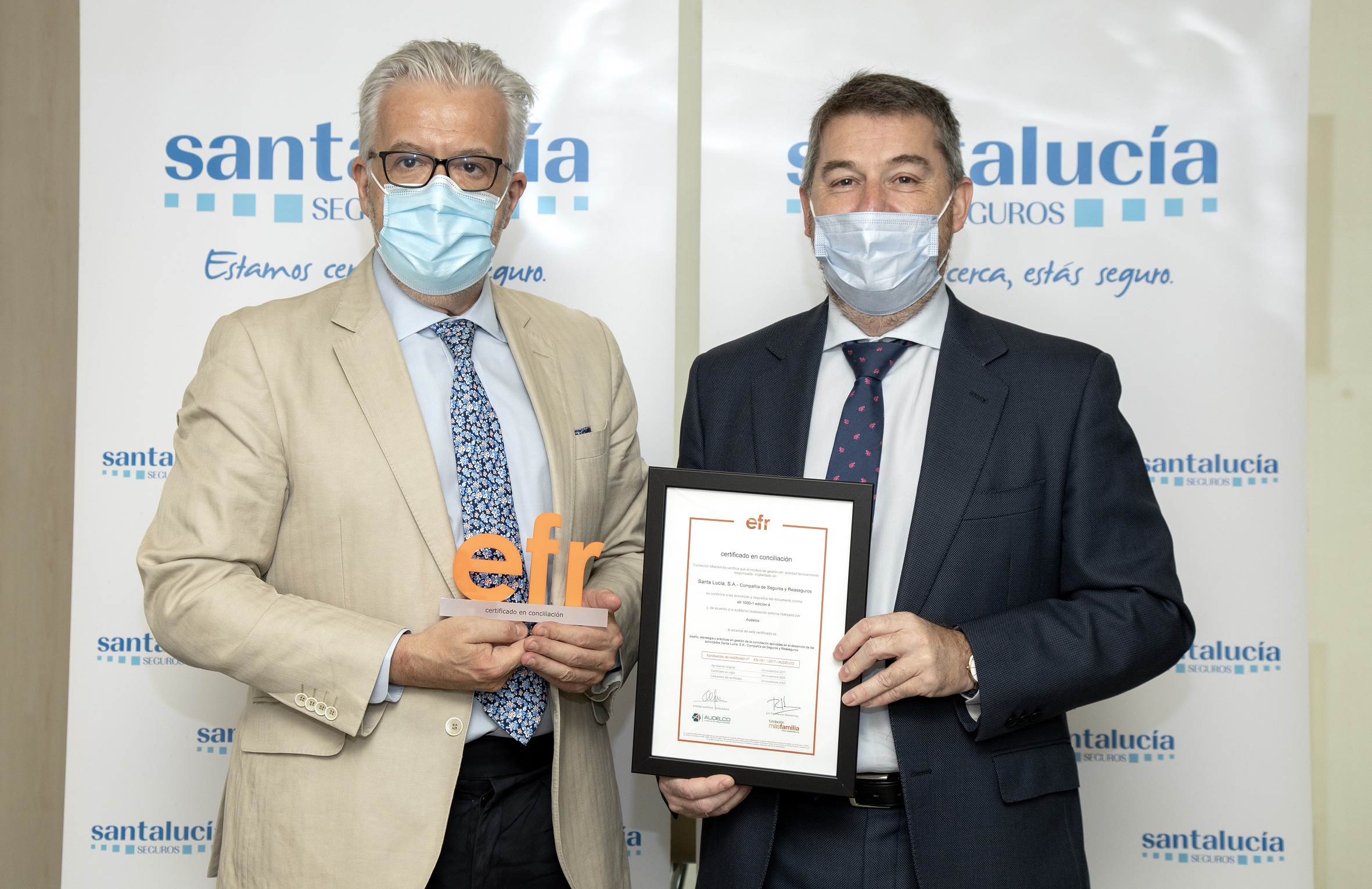 Santalucía ha superado la auditoría para la renovación de su sello efr de la Fundación Másfamilia que reconoce a aquellas empresas que promueven la gestión de personas teniendo en cuenta sus circunstancias laborales, personales y familiares. Cada ciclo dura tres años, durante los cuales se realizan auditorías de mantenimiento anuales y, finalmente, la auditoría de recertificación.