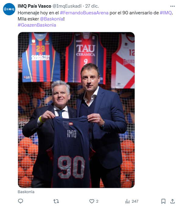 Luis Fernández de Larrea, agradeció en nombre de la aseguradora vasca, "un homenaje, que representa mucho para nosotros como reconocimiento no solo al trabajo conjunto que hemos venido realizando durante estos 16 años de andadura, sino también a la trayectoria de servicio en favor de la salud por parte de una compañía que se siente profundamente arraigada al territorio y a actividades colectivas tan saludables como el deporte". Para IMQ, señaló, "apoyar al Baskonia significa apostar por la salud y los valores que inspiran al deporte, además de ser uno de los clubes más destacados del baloncesto europeo, con numerosos títulos nacionales e internacionales en su haber".