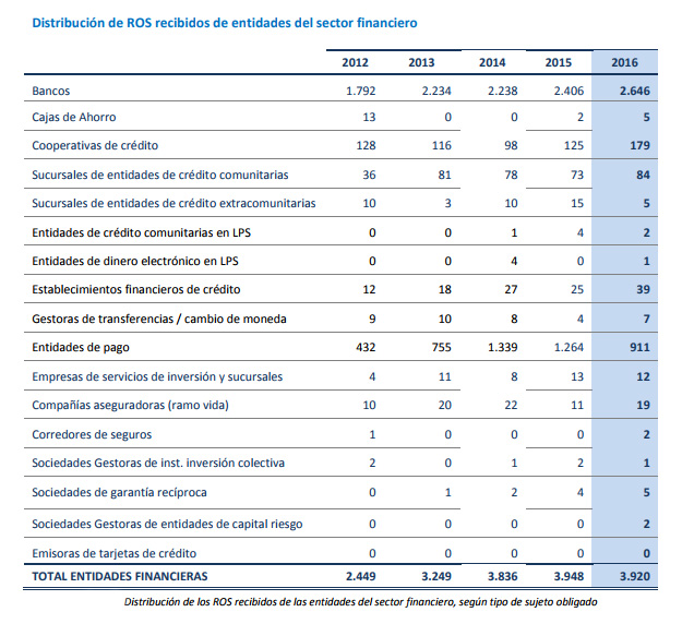 El Servicio Ejecutivo de la Comisión de Prevención del Blanqueo de Capitales (Sepblac) tramitó 4.990 comunicaciones de operaciones corporativas sospechosas en 2016, lo que supone un crecimiento del 4,89% respecto al año anterior. En los últimos 5 años, estas actuaciones han experimentado un aumento del 63% gracias a la mayor vigilancia, tanto de las entidades financieras como de otros sectores de sujetos obligados, según explica el Ministerio de Economía, Industria y Competitividad. El grueso de los Reportes de Operaciones Sospechosas (ROS) lo han reportado las entidades financieras, 3.920, entre ellas las compañías del sector asegurador. Según estos datos, las aseguradoras (ramo de Vida) enviaron 19 ROS frente a los 11 de un año antes; y los corredores 2, ninguna el año anterior. En total, 21 ROS frente a los 11 de 2015, lo que supone un crecimiento del 90,9%.