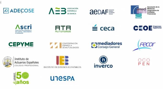 Los firmantes de este manifiesto conjunto son Adecose, AEB, Aedaf, Amaef, Ascri, ATA, CECA, CEOE, Cepyme, la Confederación Española de Mutualidades, el Consejo General de Colegios de Mediadores, Fecor, el Instituto de Actuarios Españoles, el Instituto de Estudios Económicos, Inverco, Ocopen, Unacc y Unespa.