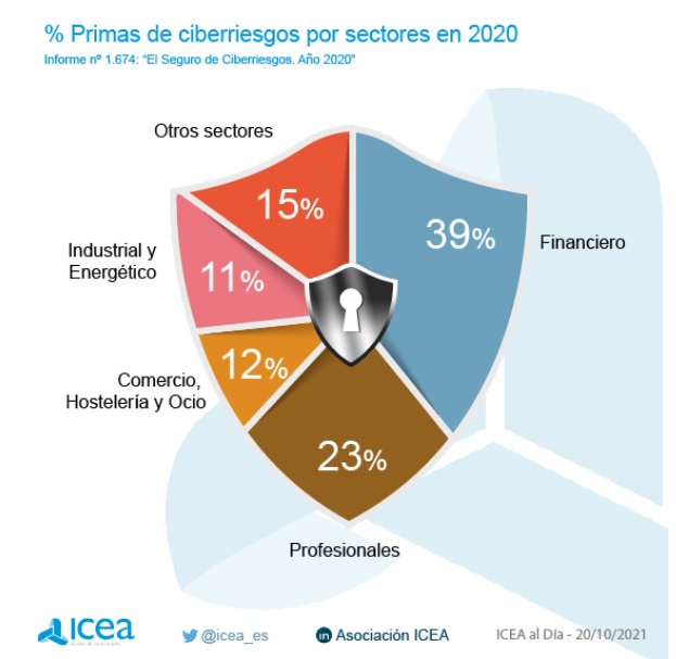 El 39% de la primas de seguros ciberriesgos las acaparó el sector financiero, seguido de los profesionales con un 23%.