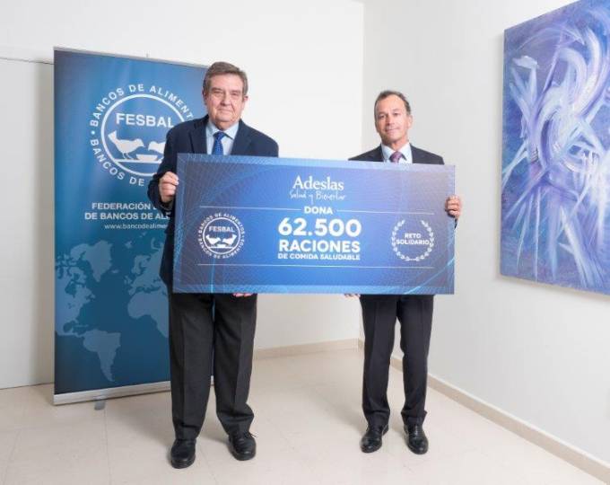 SegurCaixa Adeslas ha hecho entrega a la Federación Española de Bancos de Alimentos (Fesbal) de un cheque equivalente a 62.500 raciones de comida, cifra que se ha conseguido gracias al esfuerzo de cerca de 300 empleados de la compañía que se habían sumado al reto solidario 1Km=1Kg. Se han superado los 20.000 Km, que se transformarán en el equivalente en kilos de alimentos y permitirán distribuir 62.500 raciones de comida entre las personas necesitadas que atiende Fesbal.