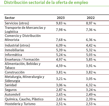 Por segundo año consecutivo, servicios es el sector que más puestos de empleo ha ofrecido en 2023 (9,83%). Le siguen transporte de mercancías y logística (7,98%), comercio y distribución minorista (7,68%) y el sector industrial (6,09%). Por delante del seguro también está el sector inmobiliario (5,39%); el informático (5,24%); la enseñanza y formación (4,97%); alimentación, bebidas y tabaco (4,59%); construcción (3,81%); metalurgia, mineralurgia y siderurgia (3,21%) y sanidad (3,06%).