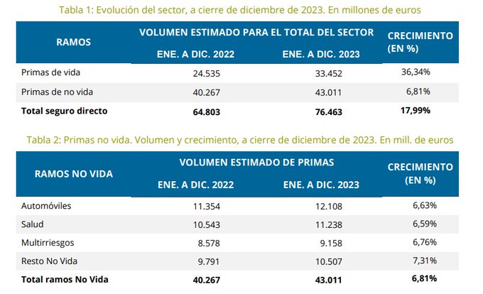 El sector asegurador ha cosechado en 2023 un resultado en ingresos no visto hasta la fecha, o al menos en los últimos 20 años. El volumen de primas ha alcanzado al cierre de diciembre pasado 76.463 millones de euros, con un crecimiento del 17,99% respecto al pasado año cuando las primas mejoraron un 4,8%.