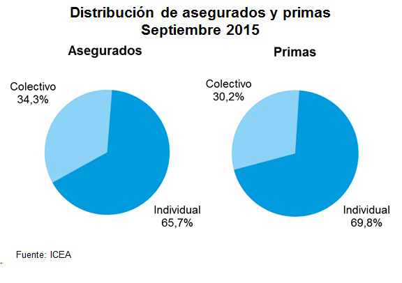 Los seguros individuales de Salud supusieron un 69,8% de la recaudación y un 65,7% de los asegurados, según datos de ICEA a septiembre de 2015. Respecto al crecimiento, los seguros colectivos crecieron un 7,4% sobre primas frente a un crecimiento del 1,8% de los seguros individuales.