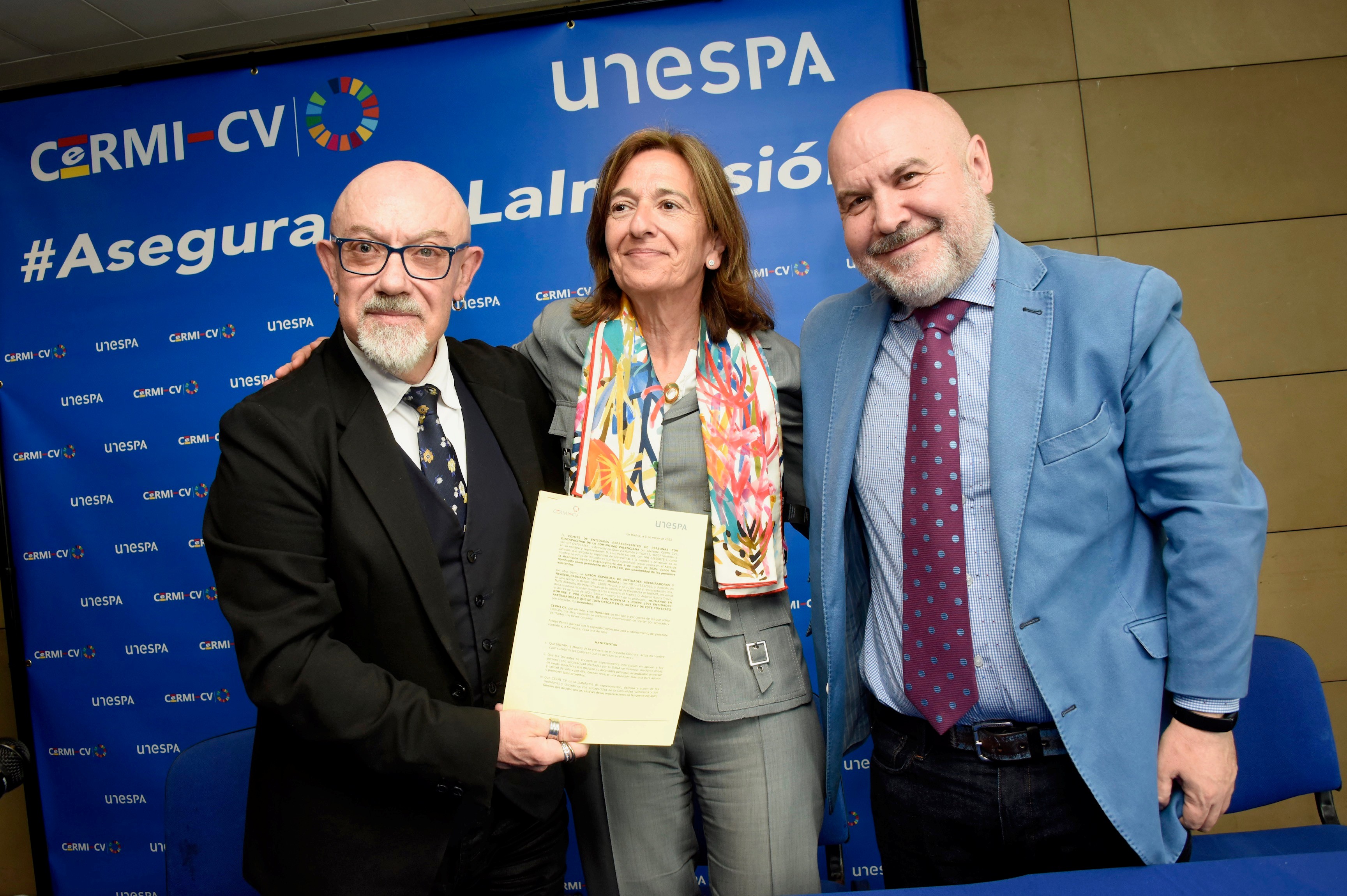 La entrega de esta cantidad se ha formalizado hoy en un encuentro en la sede de Cermi, en Valencia, con la participación de Luis Cayo, presidente de CERMI Estatal, Luis Vañó, presidente de Cermi CV, y Mirenchu del Valle, presidenta de UNESPA.