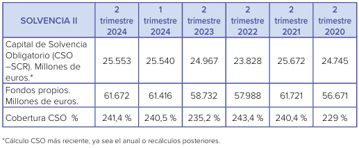 El sector asegurador español ha ido ganando fortaleza en los últimos años, dejando atrás el revés que supuso la pandemia por el covid-19. Al cierre del segundo trimestre de 2024, el conjunto del sector presentaba un margen de solvencia -ratio de cobertura del capital de solvencia obligatorio- del 241,4%, nada menos que 12,4 puntos por encima del registrado en el segundo trimestre de 2020, que se situaba en el 229%. Detrás de este incremento está el aumento significativo de los fondos propios en este periodo, que han crecido un 8,8%, elevándose ahora hasta los 61.672 millones.