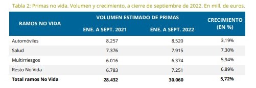 De este total, 30.060 millones de euros corresponden a No Vida, experimentando un crecimiento del 5,72%. De sus principales ramos, Autos sigue siendo el que más aporta a la recaudación con 8.520 millones, aumentando un 3,19%. Detrás se sitúa Salud, que un trimestre más crece a pasos agigantados. En septiembre de 2022, se ha disparado un 7,3%, hasta los 7.915 millones. Entre sus modalidades, Asistencia Sanitaria ha repuntado un 7,64%; Reembolso, un 6,28%; mientras que Subsidio ha caído un 1,19%.
