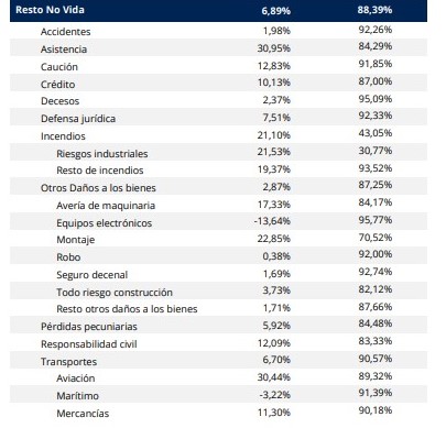 En cuanto al Resto de No Vida -categoría que engloba en su mayoría los seguros empresariales-, su recaudación ha aumentado un 6,89%, elevándose hasta los 7.251 millones. De todos los ramos incorporados aquí, los que más han crecido hasta septiembre son: Asistencia (+30,95%), Transportes Aviación (+30,44%), Montaje (+22,85%), Incendios (+21,10%) y Avería de maquinaria (+17,33%). Y solo dos han reducido su volumen de primas: Transportes Marítimo (-3,22%) y Equipos electrónicos (-13,64%).