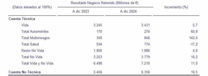 Dentro de la cuenta técnica, el seguro logra un incremento del 11% hasta los 7.210 millones. Destaca por encima de todos en No Vida, el resultado de Multirriesgos que mejora más del 142%; Autos aporta 274 millones y dispara su resultado casi un 61%. El Resto de No Vida crece un 5%. La única línea de negocio que empeora su resultado es Salud al retroceder un 17,2%. Este ramo aporta a los resultados 774 millones.