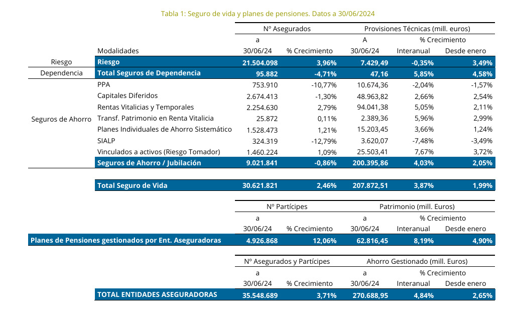 Esta cifra se ve mejorada tanto por los seguros de Vida -aunque cuenta con una ligera caída de Vida Riesgo- como por la parte de Planes de Pensiones que gestionan las entidades aseguradoras. En total, entre asegurados y partícipes, el seguro da servicio a 35,5 millones, un 3,7% más que en junio de 2023.